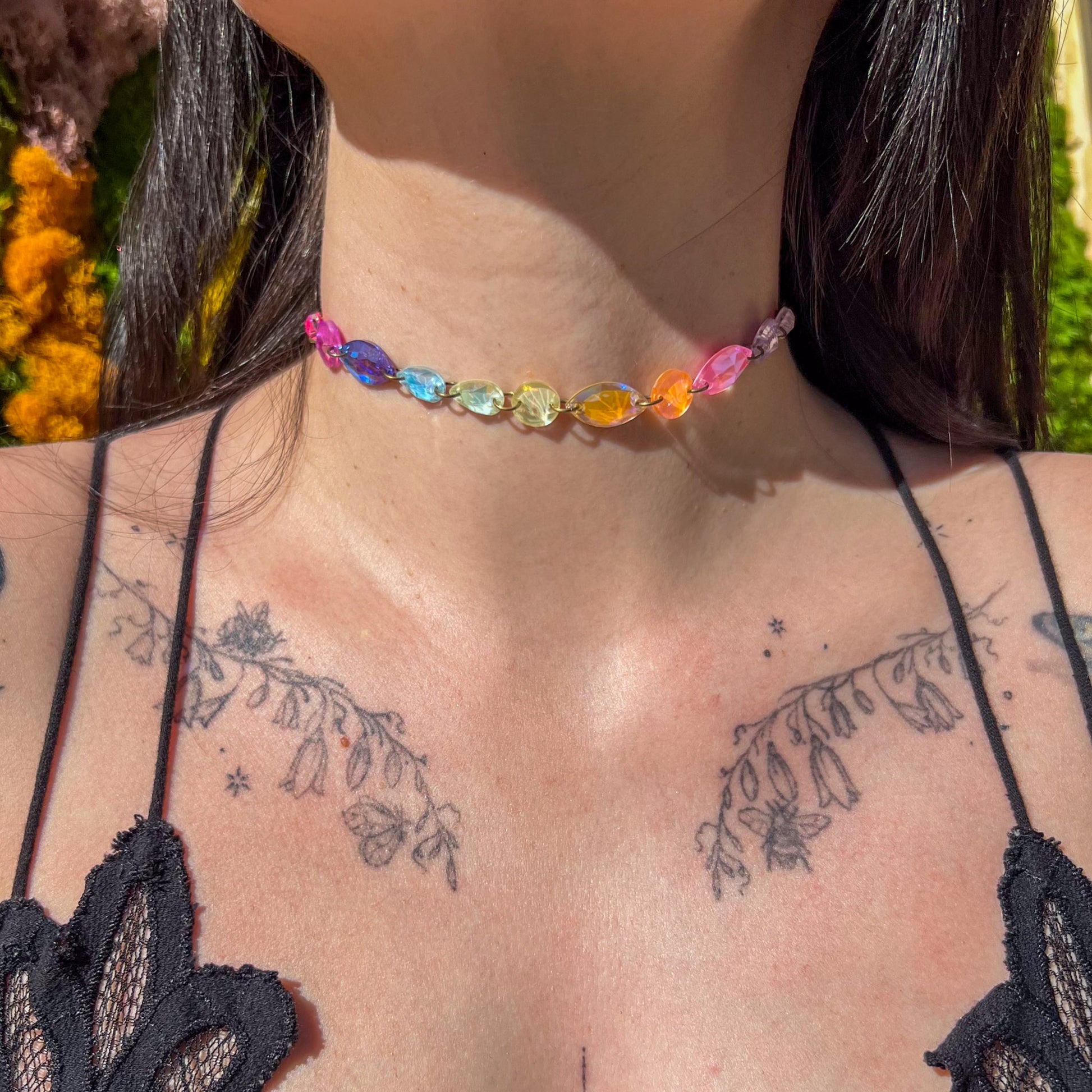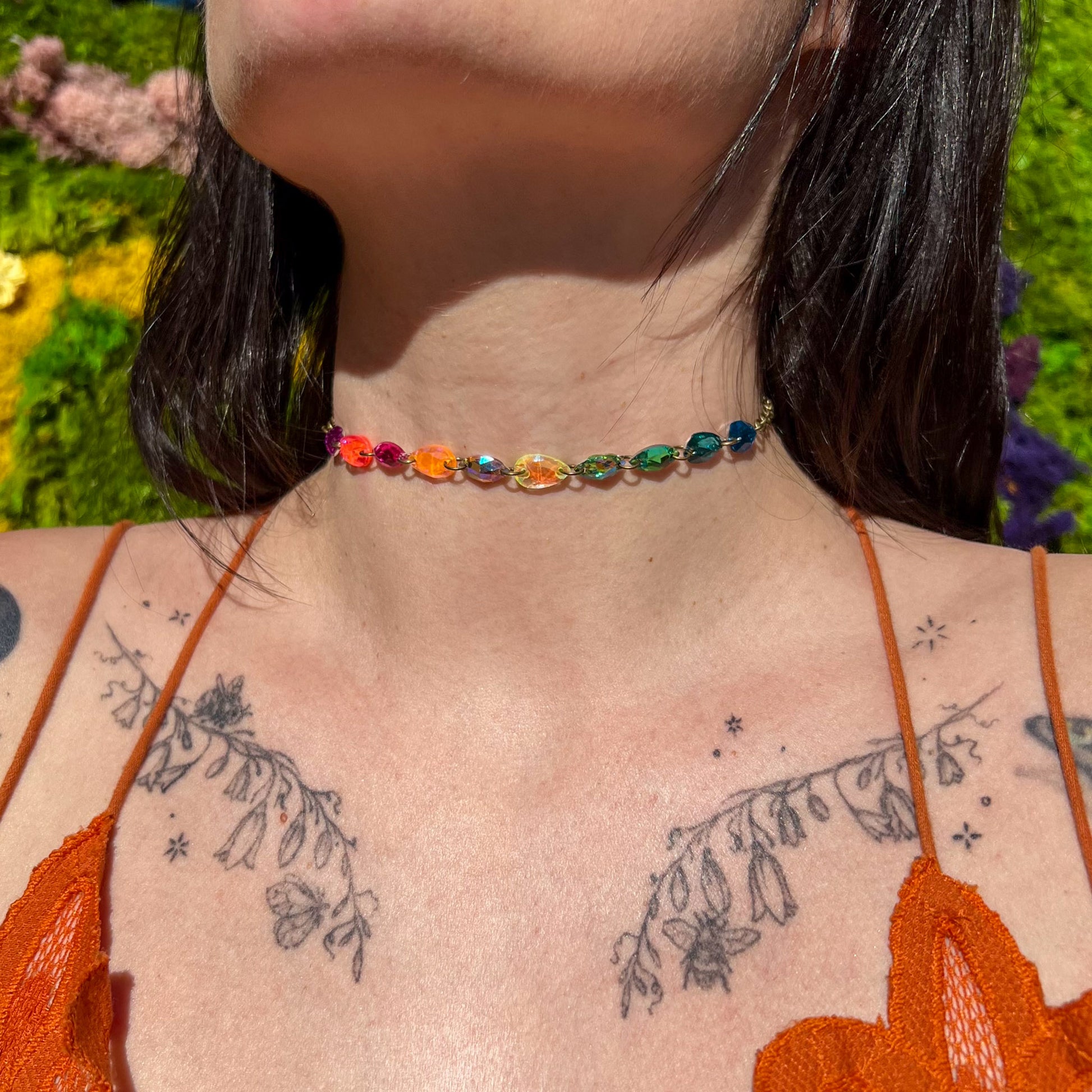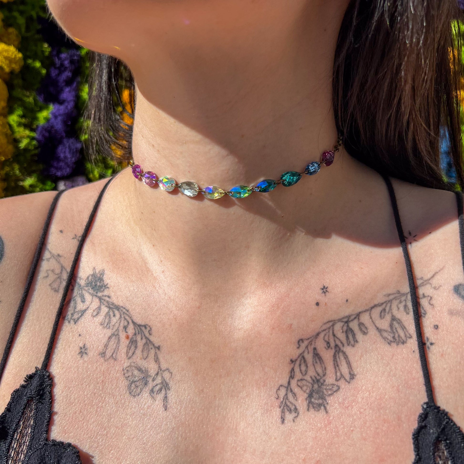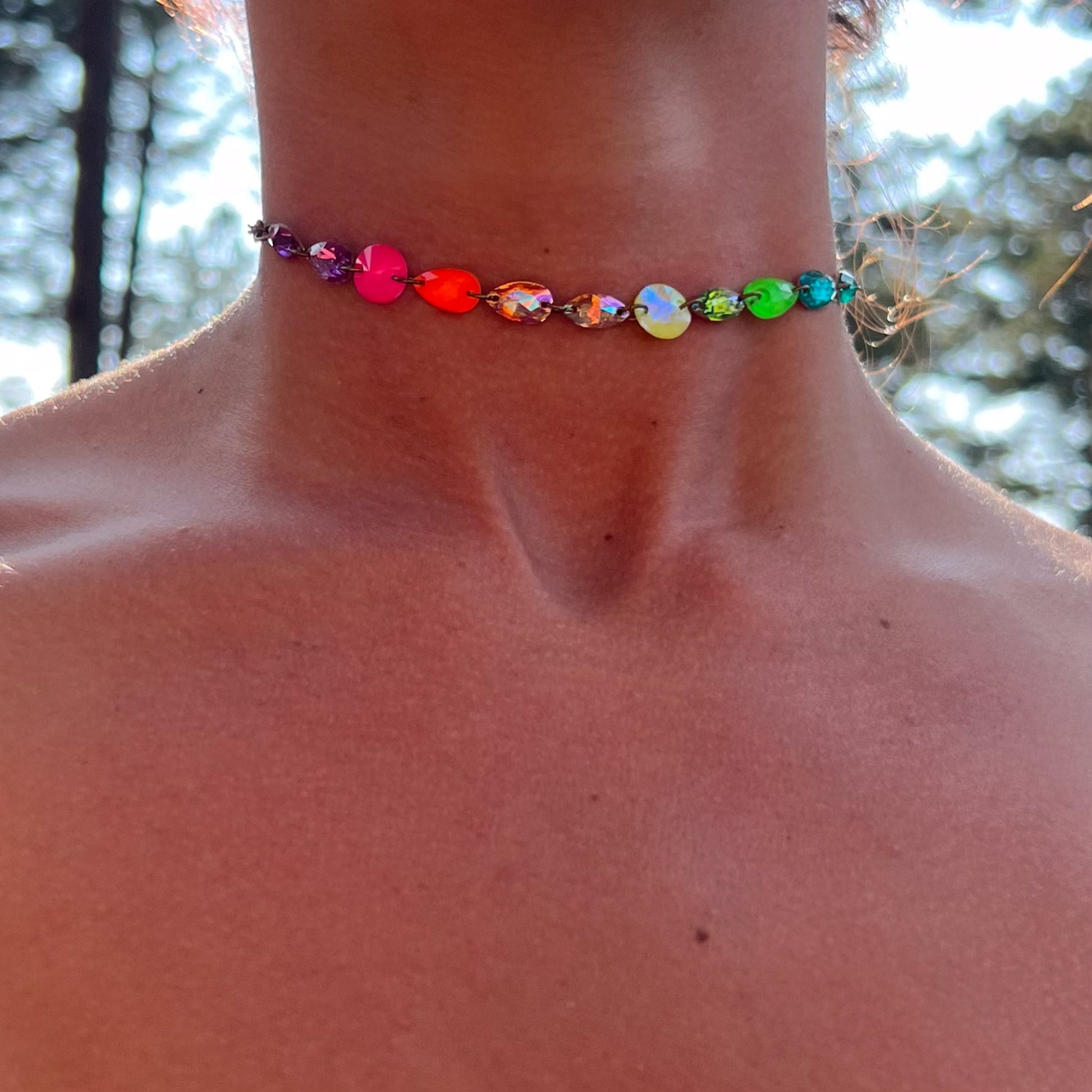 Introducing our enchanting $50 Fairy Sparkle Choker Deal! Running until supplies last. The colors are thoughtfully chosen by our skilled artist, ensuring that every necklace is a one-of-a-kind creation. THE PHOTOS ARE JUST EXAMPLES of what you may get, although every single person that orders will receive a one of a kind piece made uniquely for them. The price is 20-30% off the retail price, reflecting the fact that the artist gets to choose the crystals and colors, although we ensure it will be a colorful and sparkly piece of magic