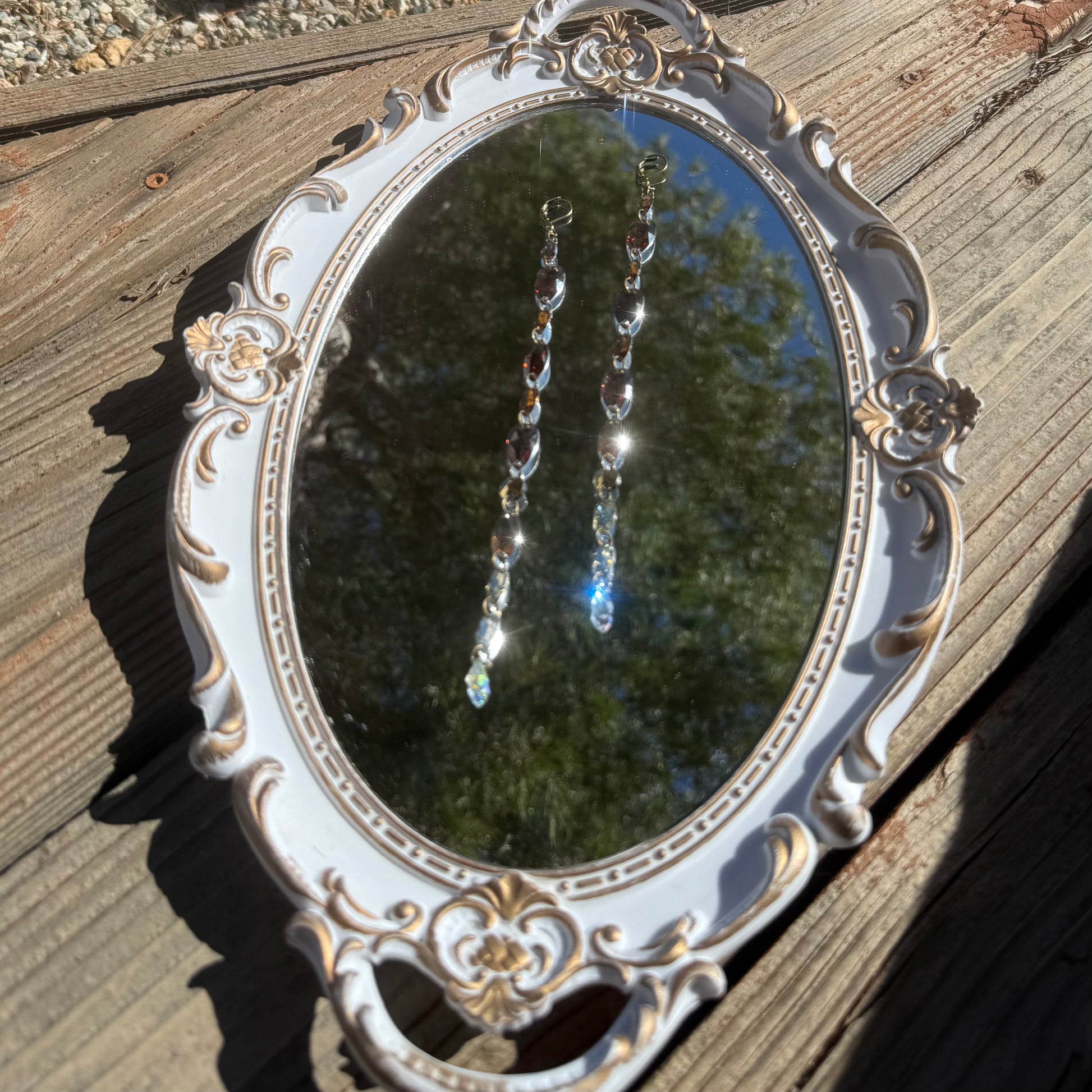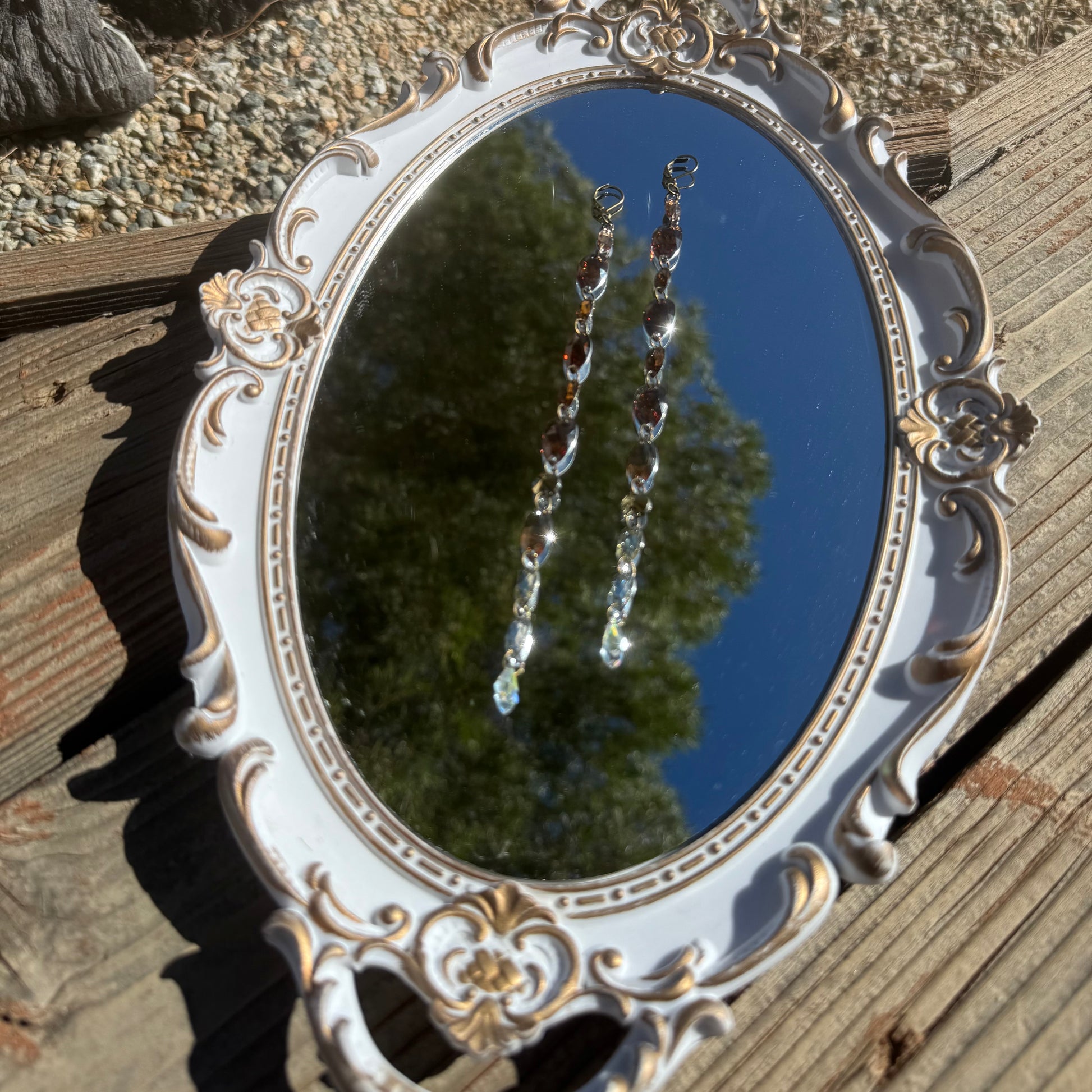 Light as a feather and radiant as the sun — these long, hand-crafted earrings shimmer with crystal sun catchers that cast tiny rainbows wherever you go. Each pair features French brass clasps that are secure, gauge-friendly, and effortlessly comfortable. They feel like wearing light itself — floating, glimmering, alive with color.
