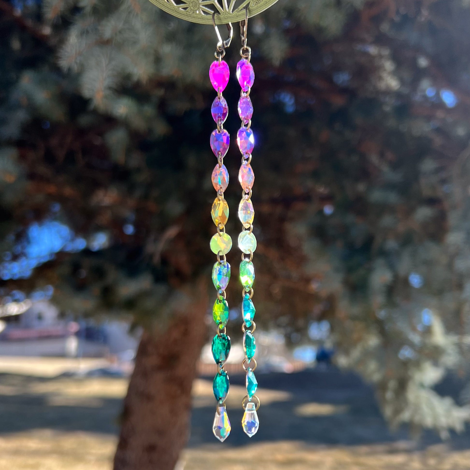 Behold these ONE OF A KIND Suncatcher Earrings, a celestial fusion of ethereal energies and cosmic allure. Crafted from the threads of destiny, these mystical earrings resonate with an otherworldly love and radiate transcendental vibrations.
