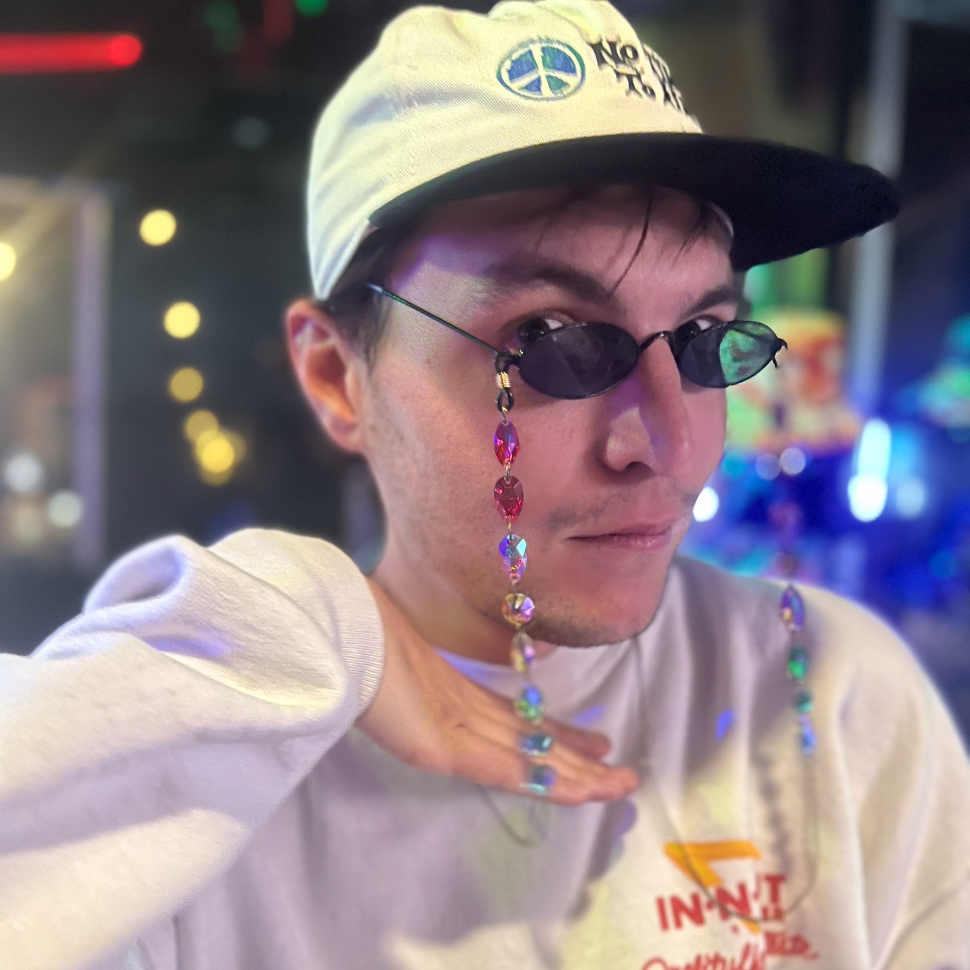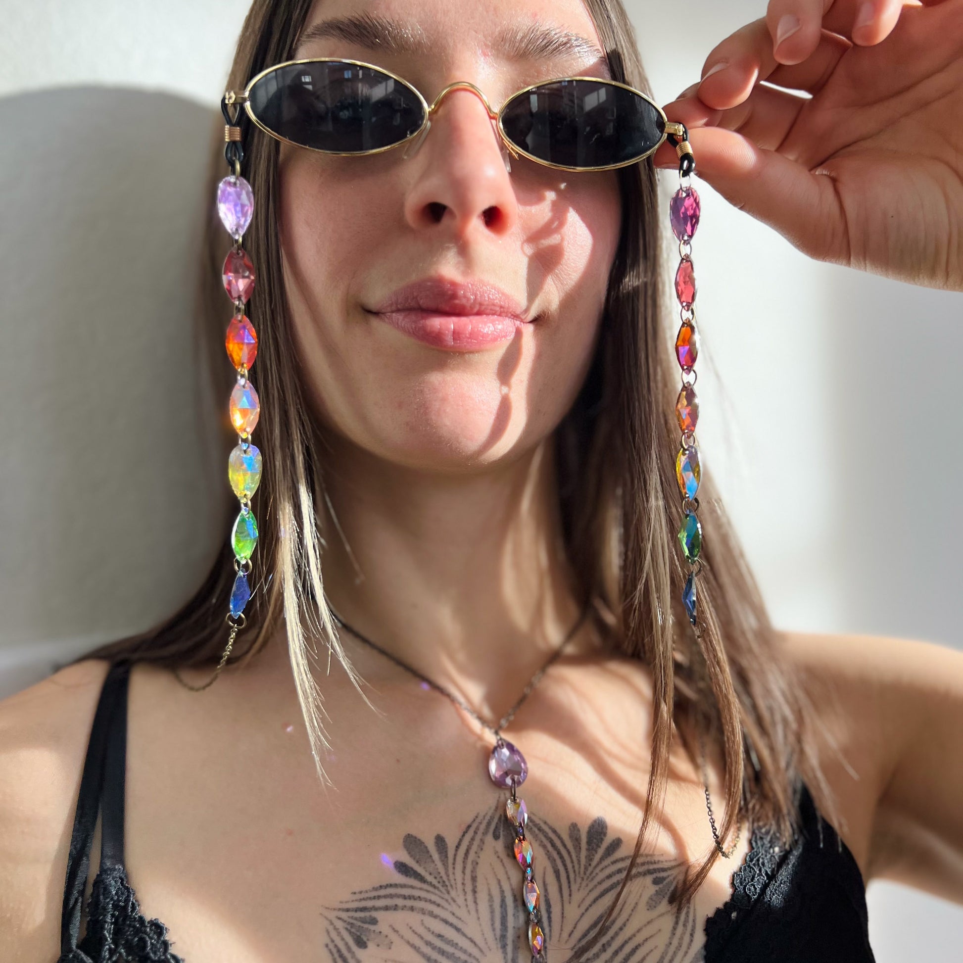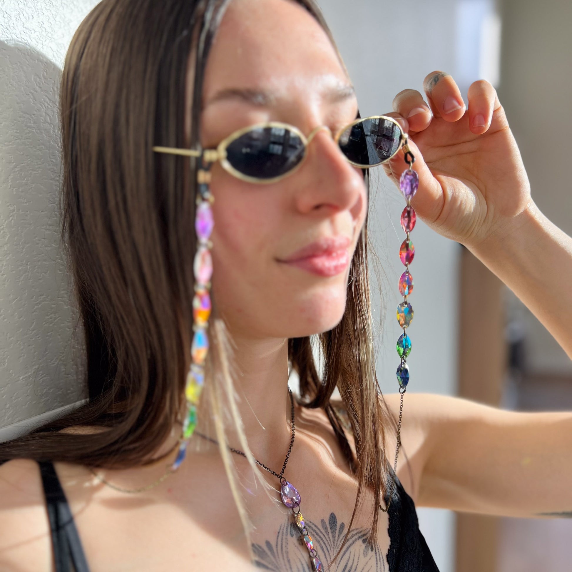 These chains are custom so each pair will be different based on what colors you choose. If you don't have a preference they will be made in rainbow pattern shown above, but I can truly make whatever color combo you heart desires. These enchanting chains are imbued with the magic of versatility, designed to elegantly complement any pair of glasses or sunglasses. They effortlessly detach and attach, allowing you to customize your look at will. Each chain is crafted to resonate with your unique vibe, promising to dazzle and cast sparkles that dance harmoniously with you through the night.