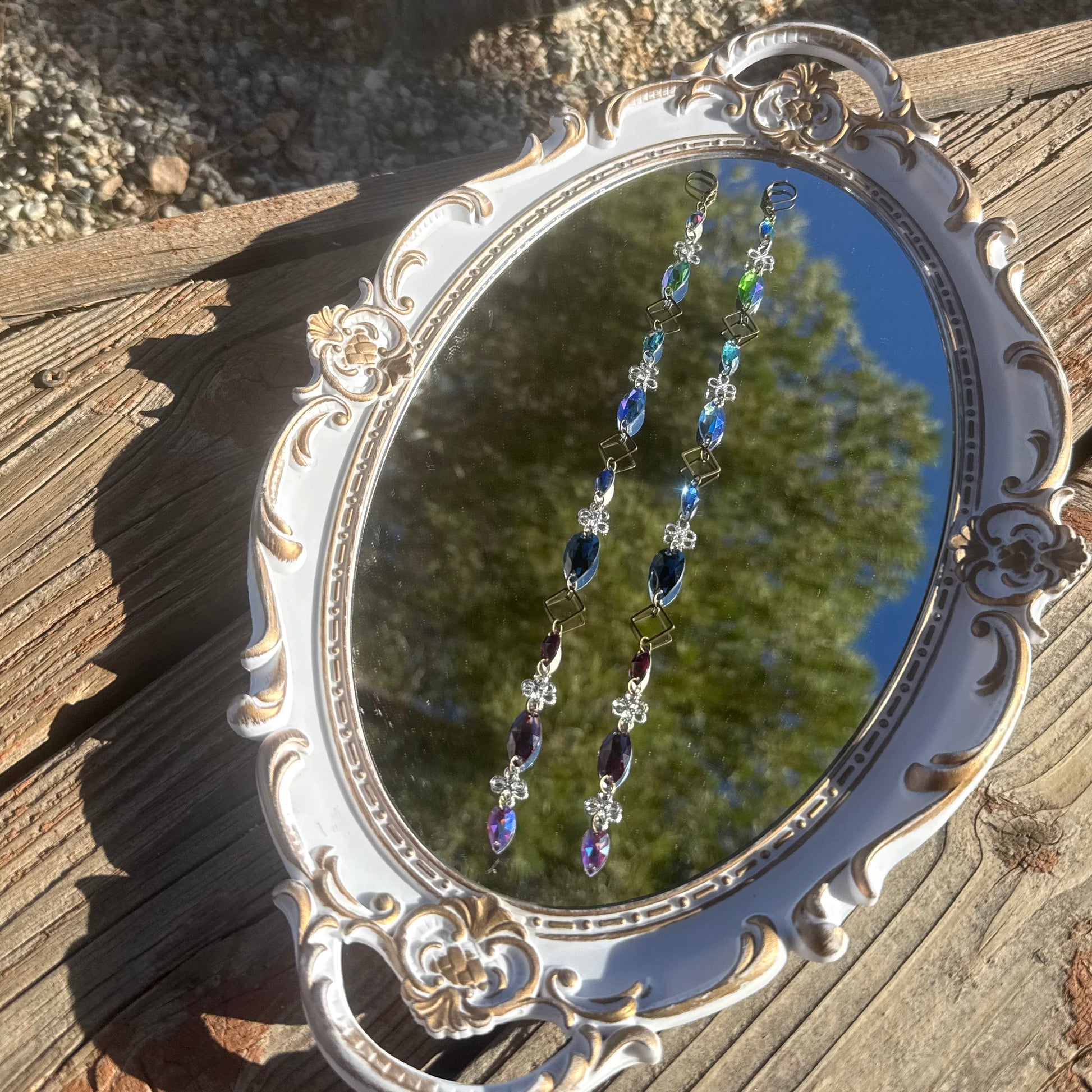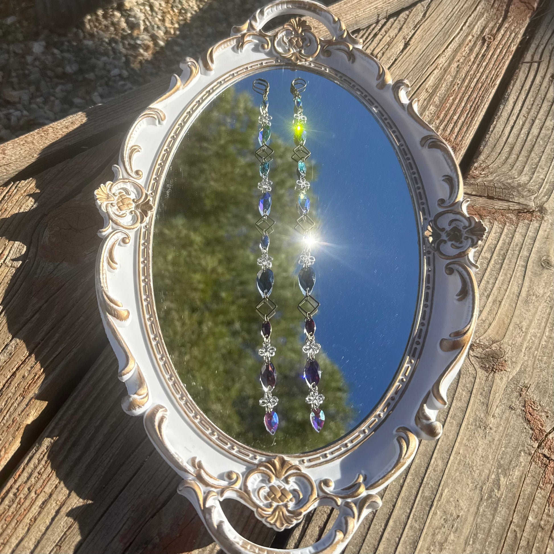 Light as a feather and radiant as the sun — these long, hand-crafted earrings shimmer with crystal sun catchers that cast tiny rainbows wherever you go. Each pair features French brass clasps that are secure, gauge-friendly, and effortlessly comfortable. They feel like wearing light itself — floating, glimmering, alive with color.