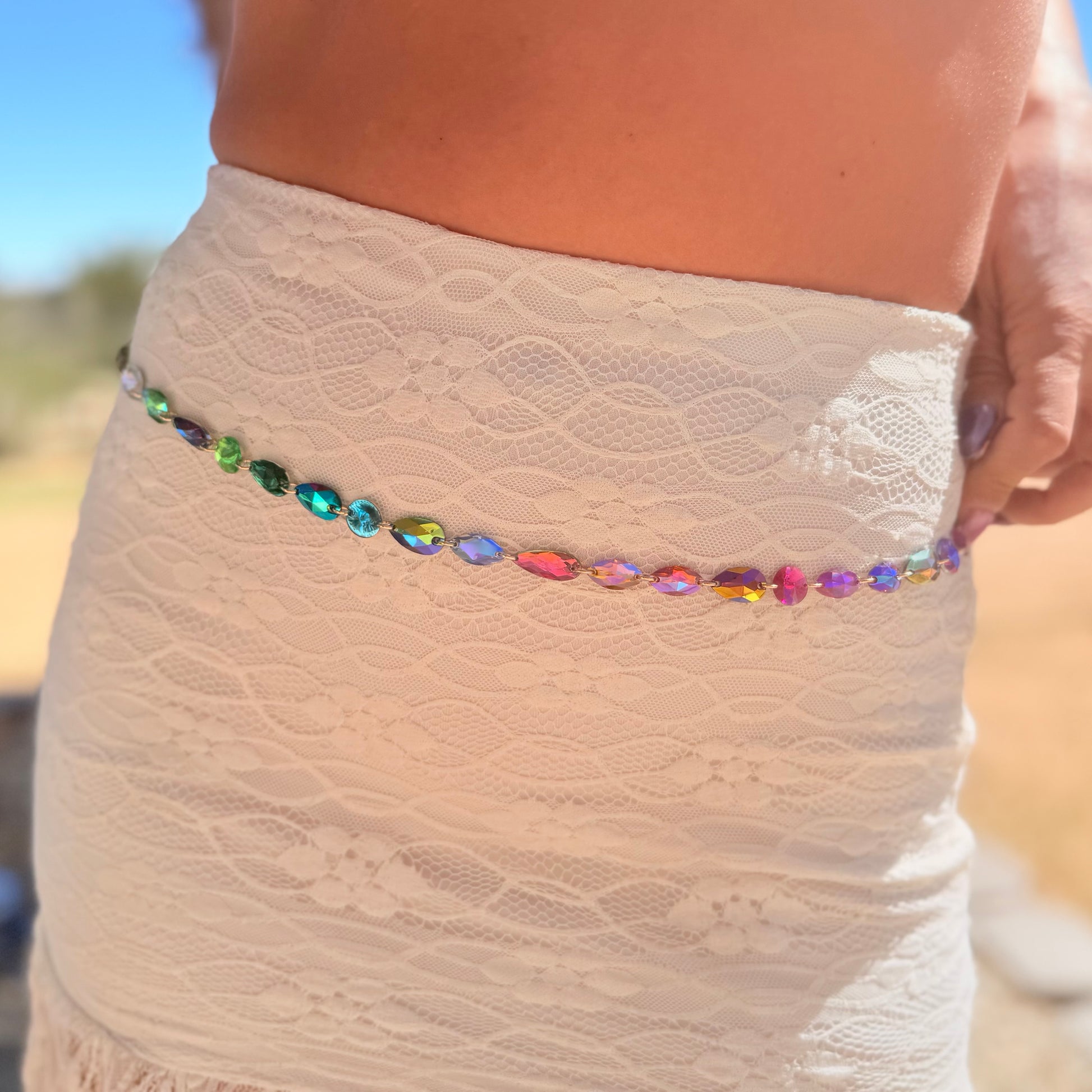 Adorn yourself in shimmering magic with these crystal belly chains, designed to move with your body and light up every moment. At 36 inches in length, they sit beautifully around the waist, but their versatility makes them so much more than just a belly chain. Wear them as a sparkling belt, weave them through your pant loops, drape them across the brim of a hat, or link them to your favorite festival fits — they transform with your imagination.