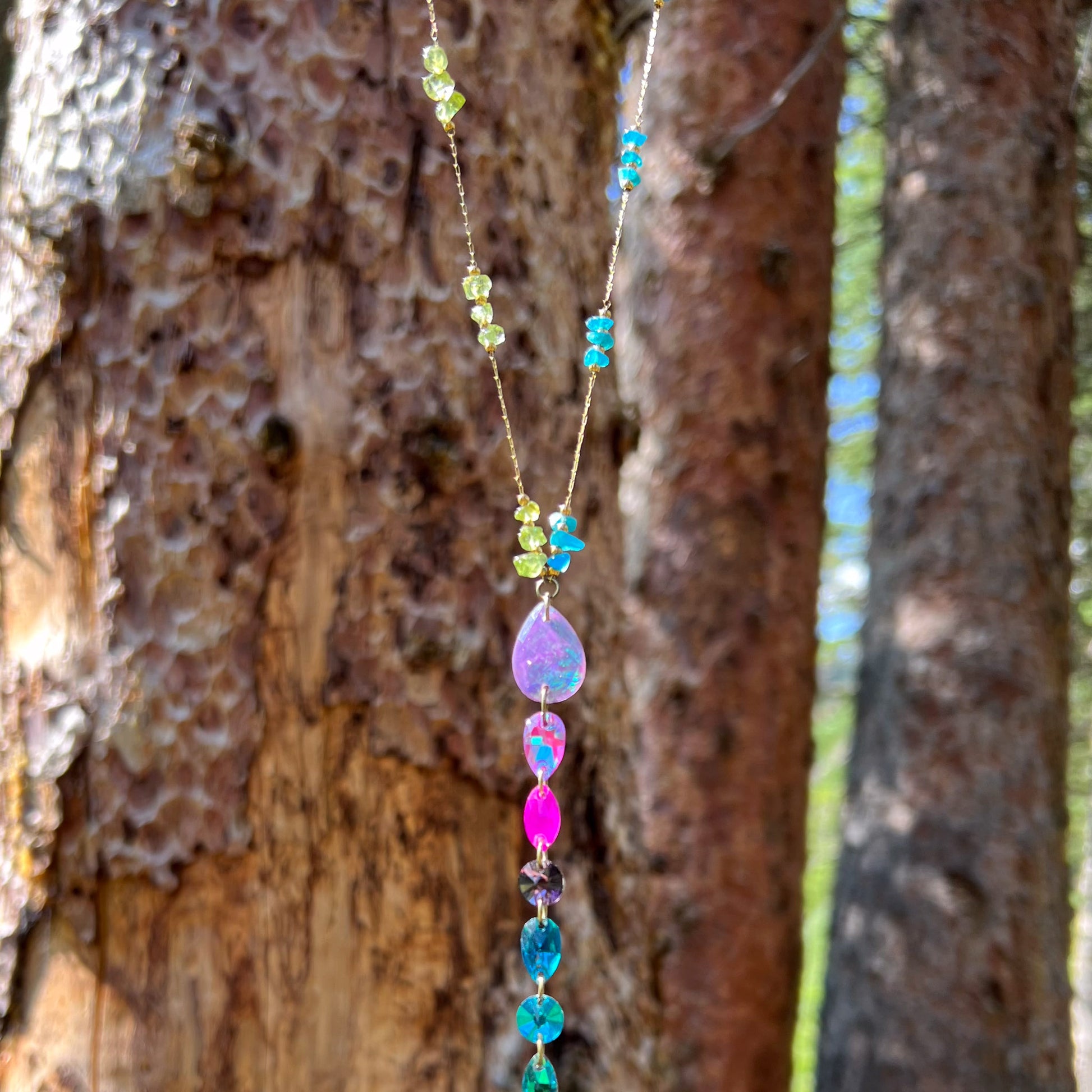 This one of a kind necklace is made on a real Aquamarine x Peridot chain, adjustable up to 16.5 inches. Draped with the most vibrant rainbow seeds of life crystals to cast rainbows while worn.