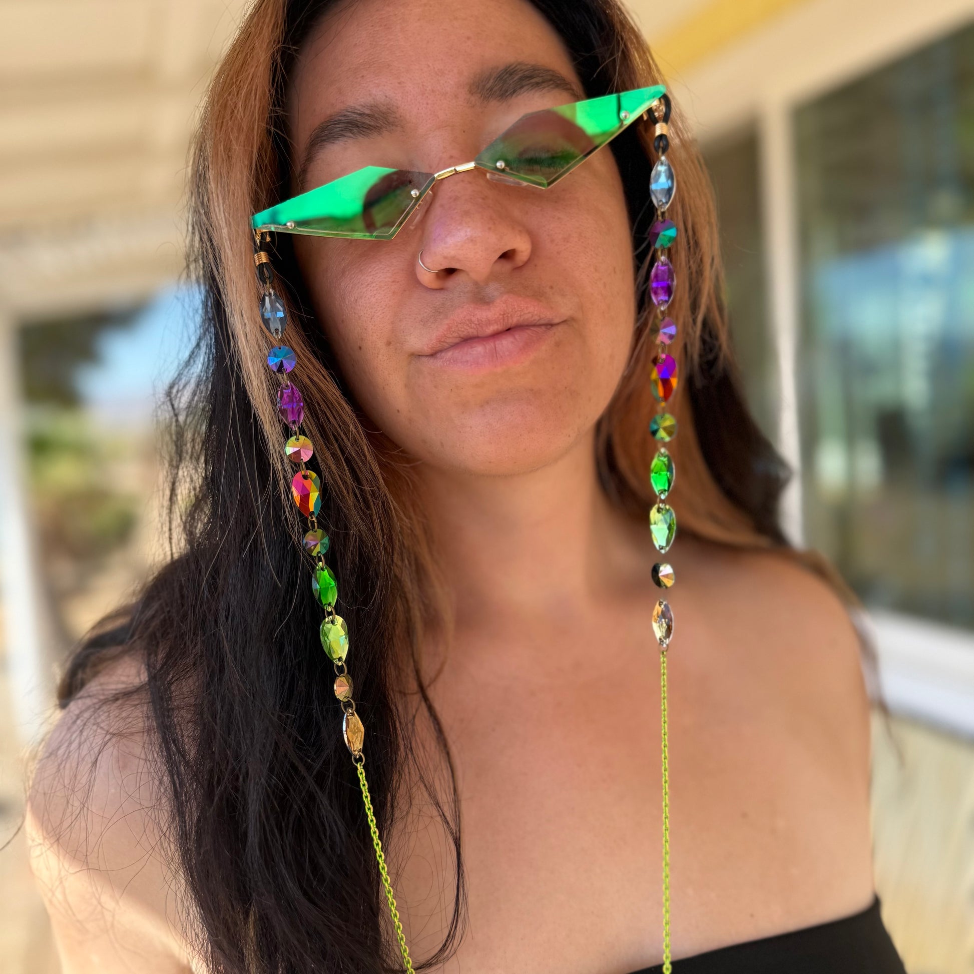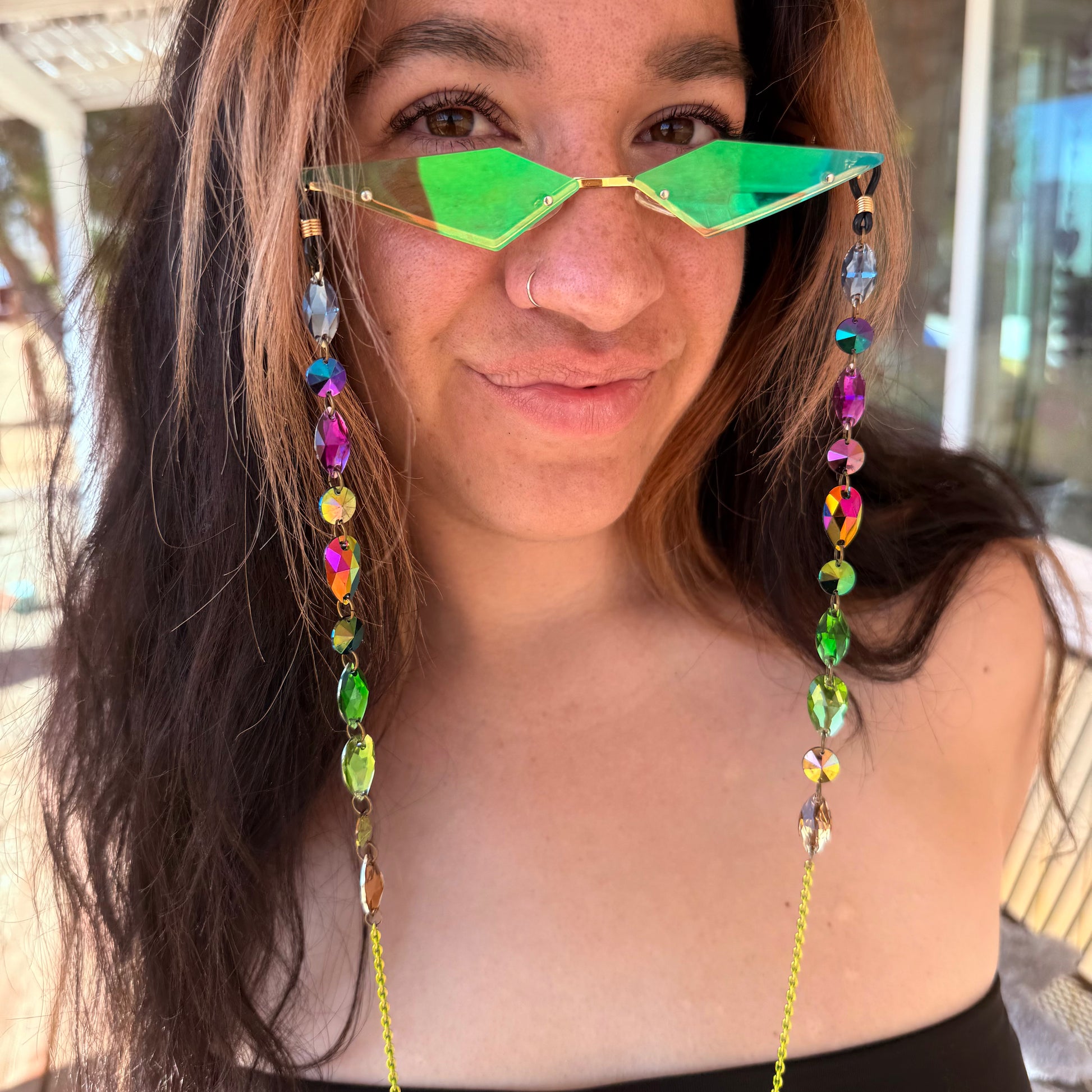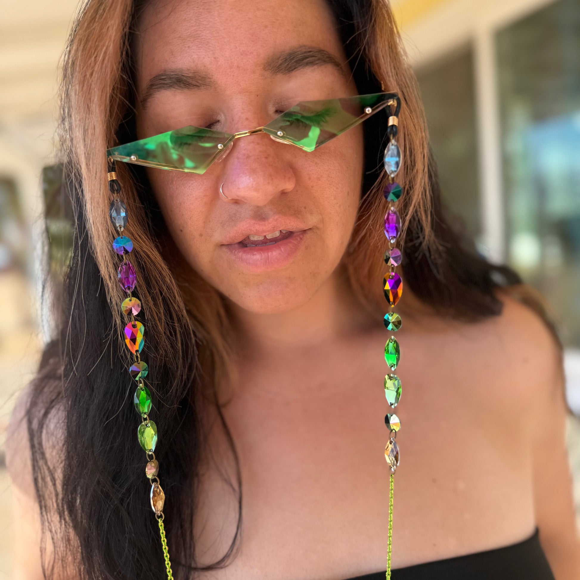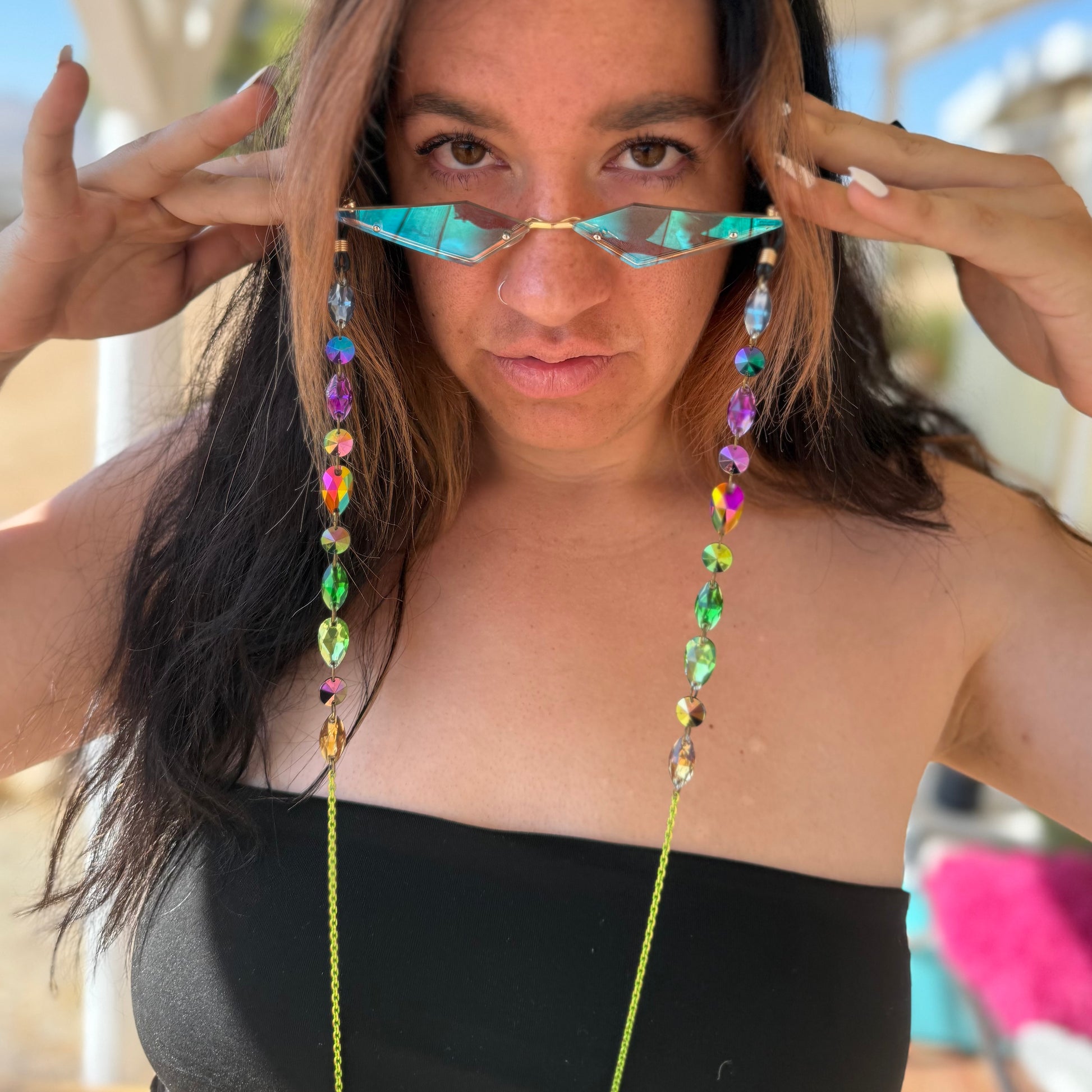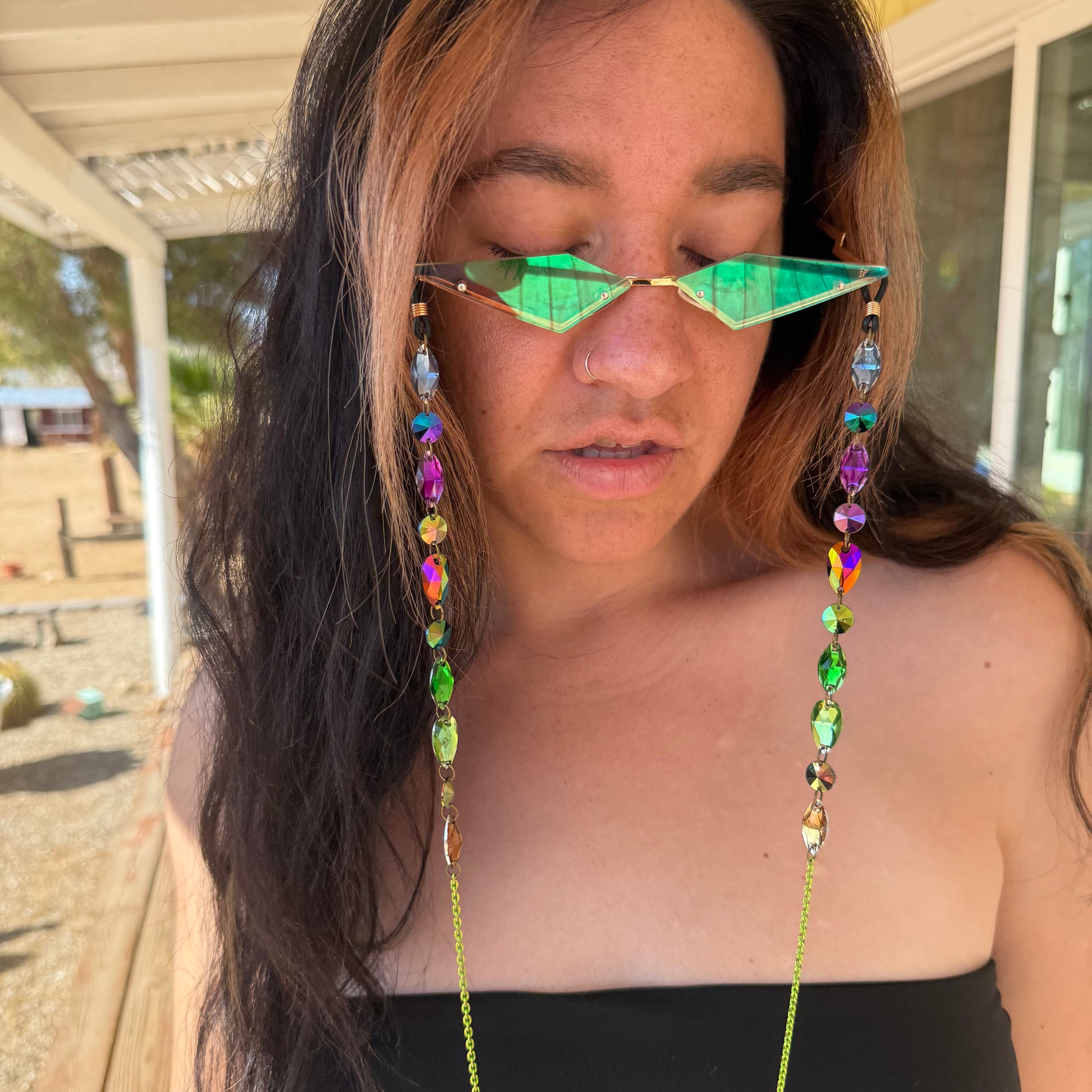 Delicate yet grounded, these detachable one of a kind sunglass chains are made with real glass crystals that catch the light and scatter subtle rainbows with every step.