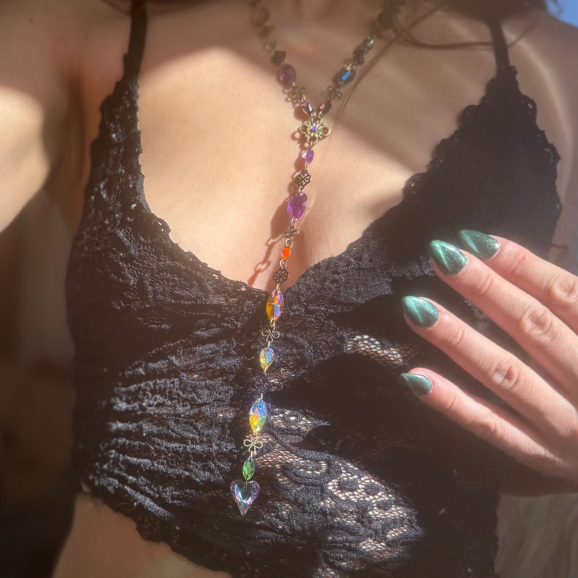 This handmade necklace is crafted from raw brass links and prismatic glass crystals that catch the sun from every angle — throwing rainbows, reflections, and little flashes of magic wherever you move.