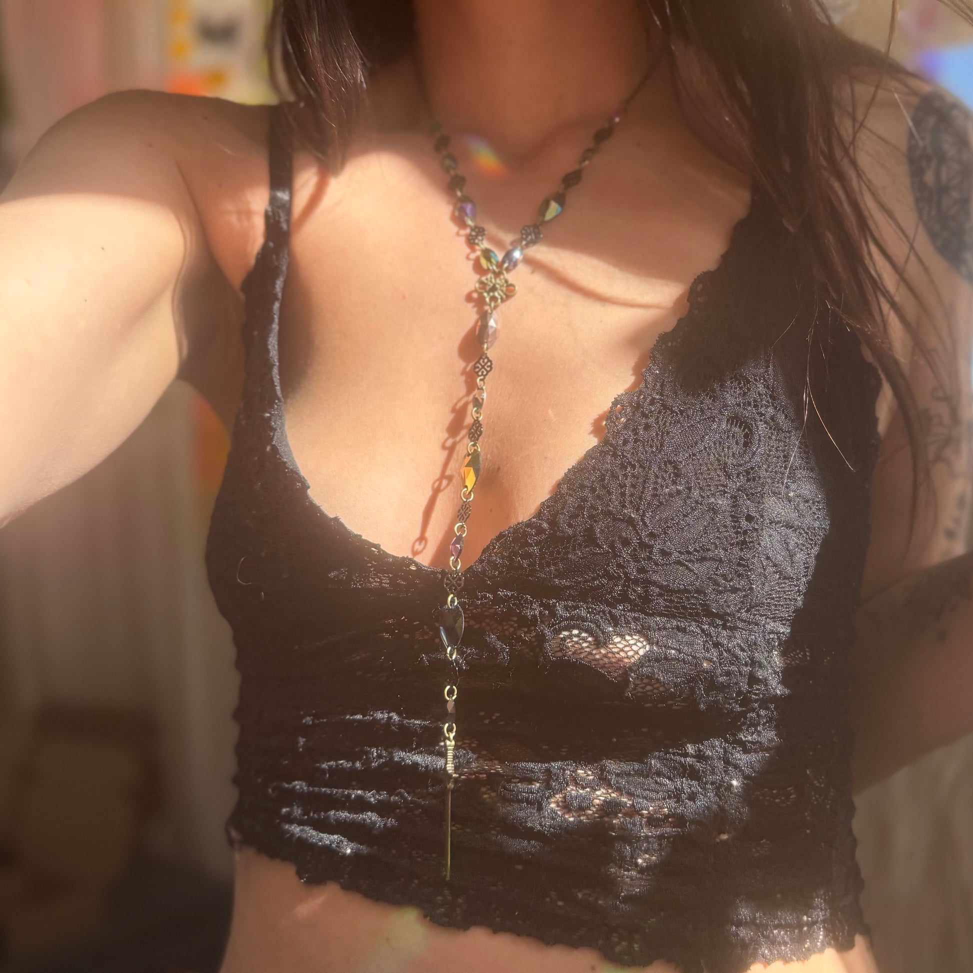 This handmade necklace is crafted from raw brass links and prismatic glass crystals that catch the sun from every angle — throwing rainbows, reflections, and little flashes of magic wherever you move.
